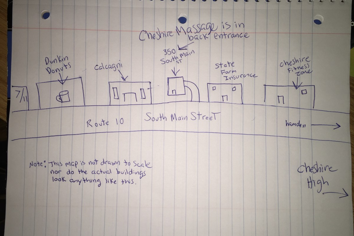 This is my artistic depiction of where we’re located. 350 South Main Street Cheshire, CT 06410. There’s ample parking in the back and we are situated on the ground floor with our own private entrance. Phone # – (203) 200-0103…